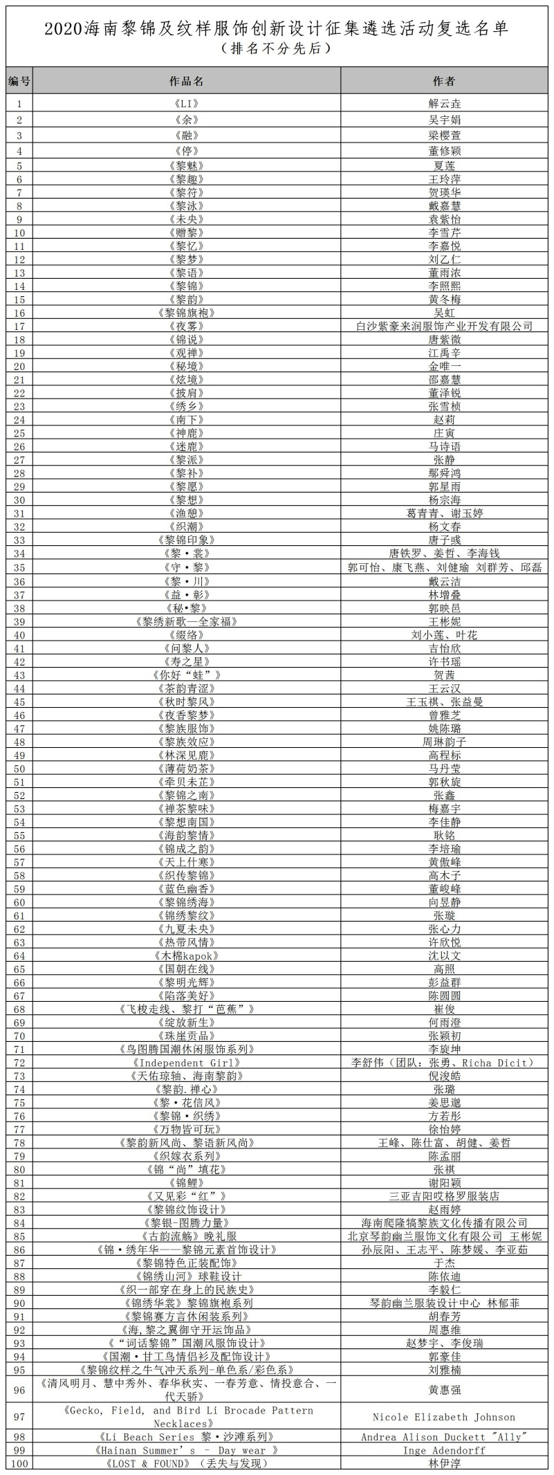 附: 2020黎錦及紋樣服飾創(chuàng)新設(shè)計(jì)征集遴選活動復(fù)選名單