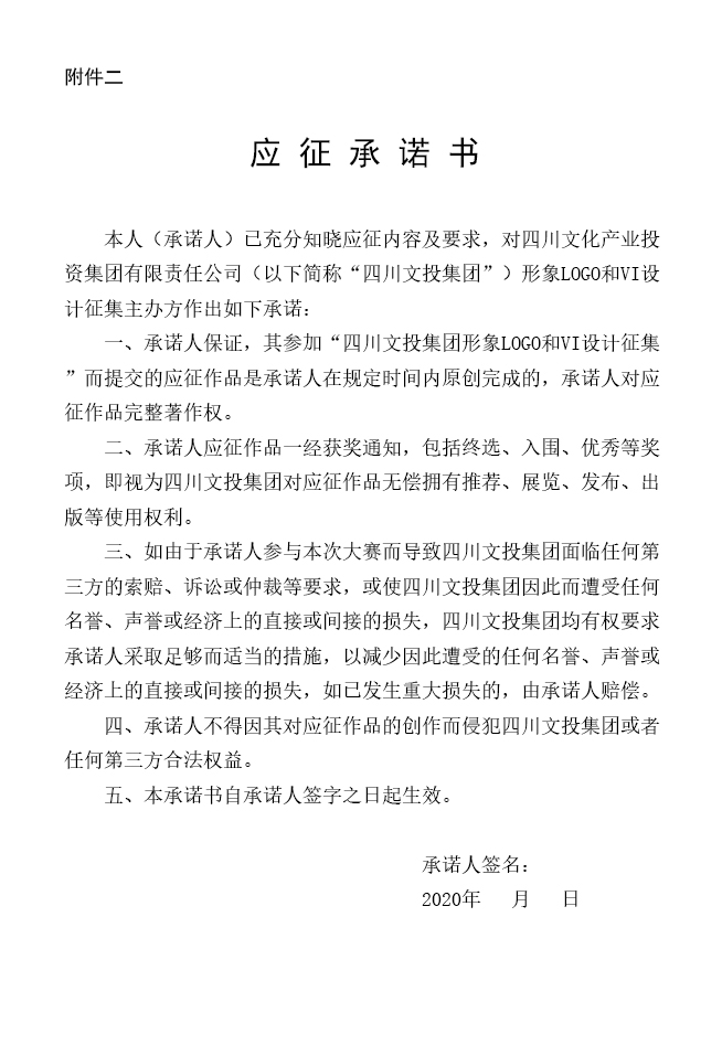 4. 投稿者須提供四川文投集團VI作品征集《應征承諾書》(附件二)。