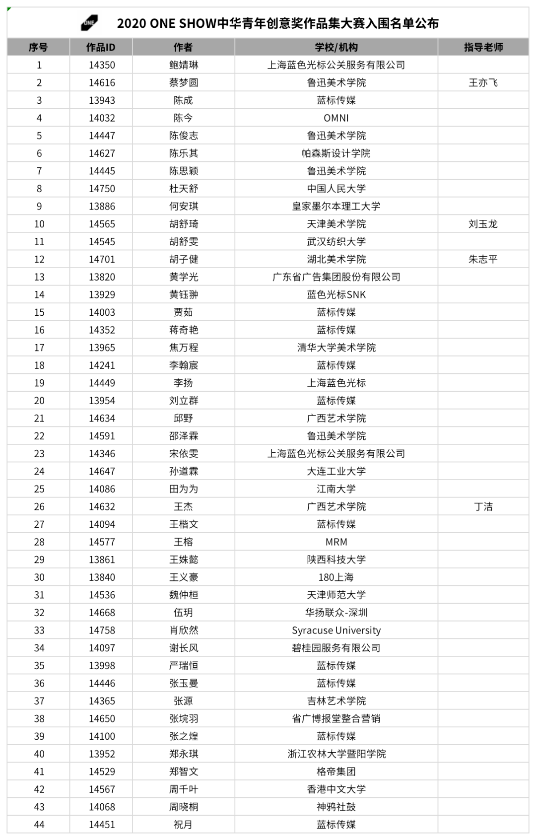 2020 One Show 中華青年創意獎 - 作品集大賽終審會于 11 月 29 日,通過線上形式成功舉辦。來自大中華區頂尖廣告公司和創意熱店的 12 位知名創意人進行了專業評審,最終共有 44 位優秀的選手入圍。