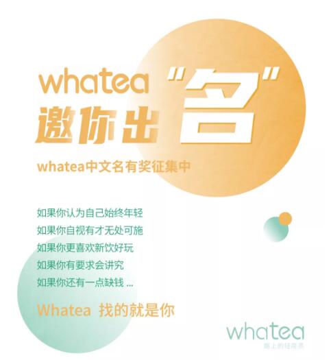 一個輕簡、且有品質不將就的茶品牌 將聚集更多的人 一起創造、分享并樂飲其中 同時也希望更多人能參與whatea茶品牌的成長 我們愿意將更好的創意 更有趣更重要的事 留給大家 同時也愿意回報更好的茶 更實在的現金獎勵 若你愿開動大腦 為whatea中文名獻出一點點的智慧 我們將不甚榮幸