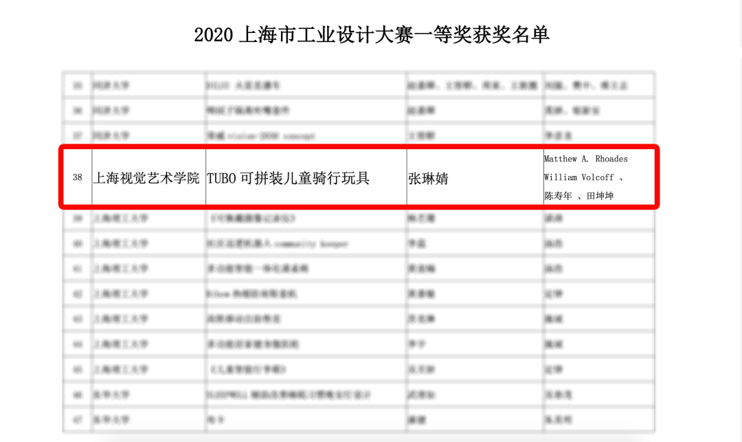 經上海市大學生工業設計大賽專家組評審,上海視覺藝術學院 產品設計(戰略設計與創新)專業2017級張琳婧同學憑借 《TUBO可拼裝兒童騎行玩具》作品斬獲上海工業設計大賽一等獎。