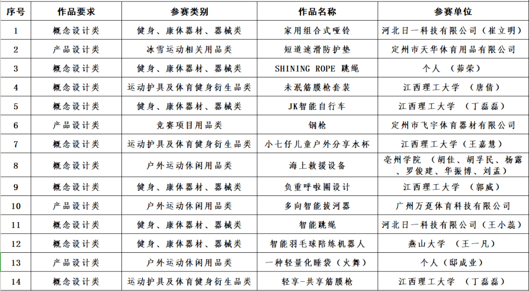 第一屆中國(定州)體育健身用品工業設計創新大賽初評工作已全部結束,共有14件參賽產品入圍大賽決賽,現將名單予以公示。公示時間:2020年12月15日至12月16日。