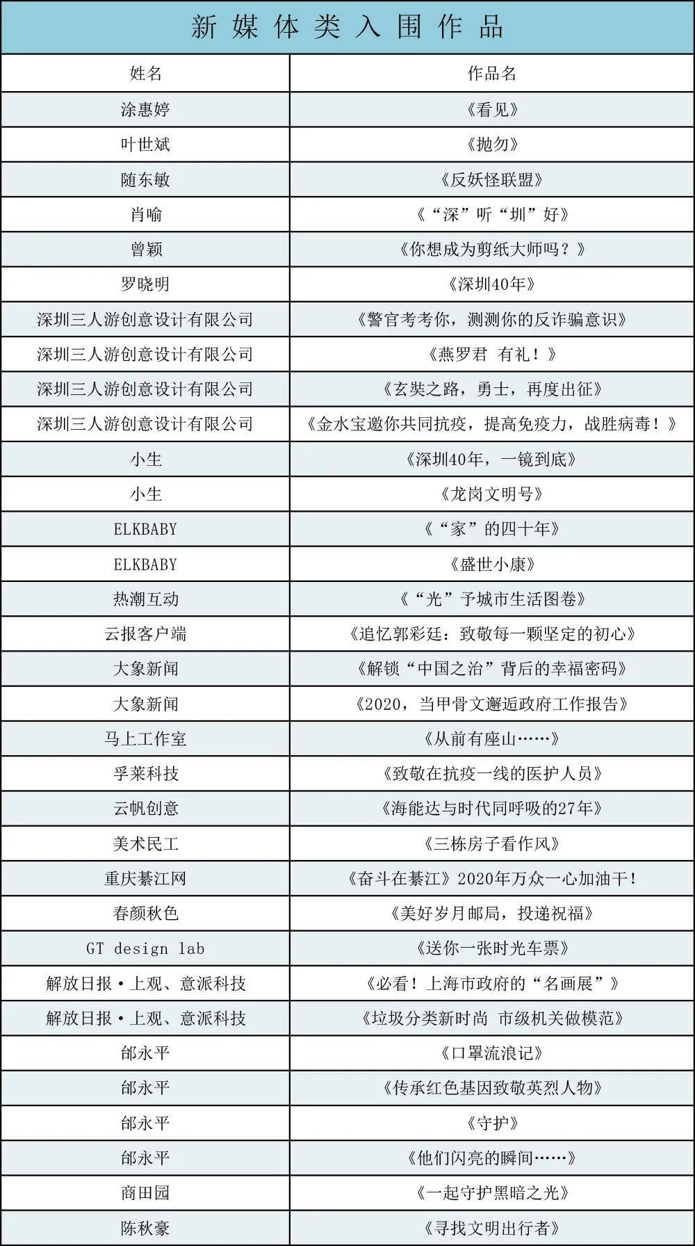 附:入圍作品名單
