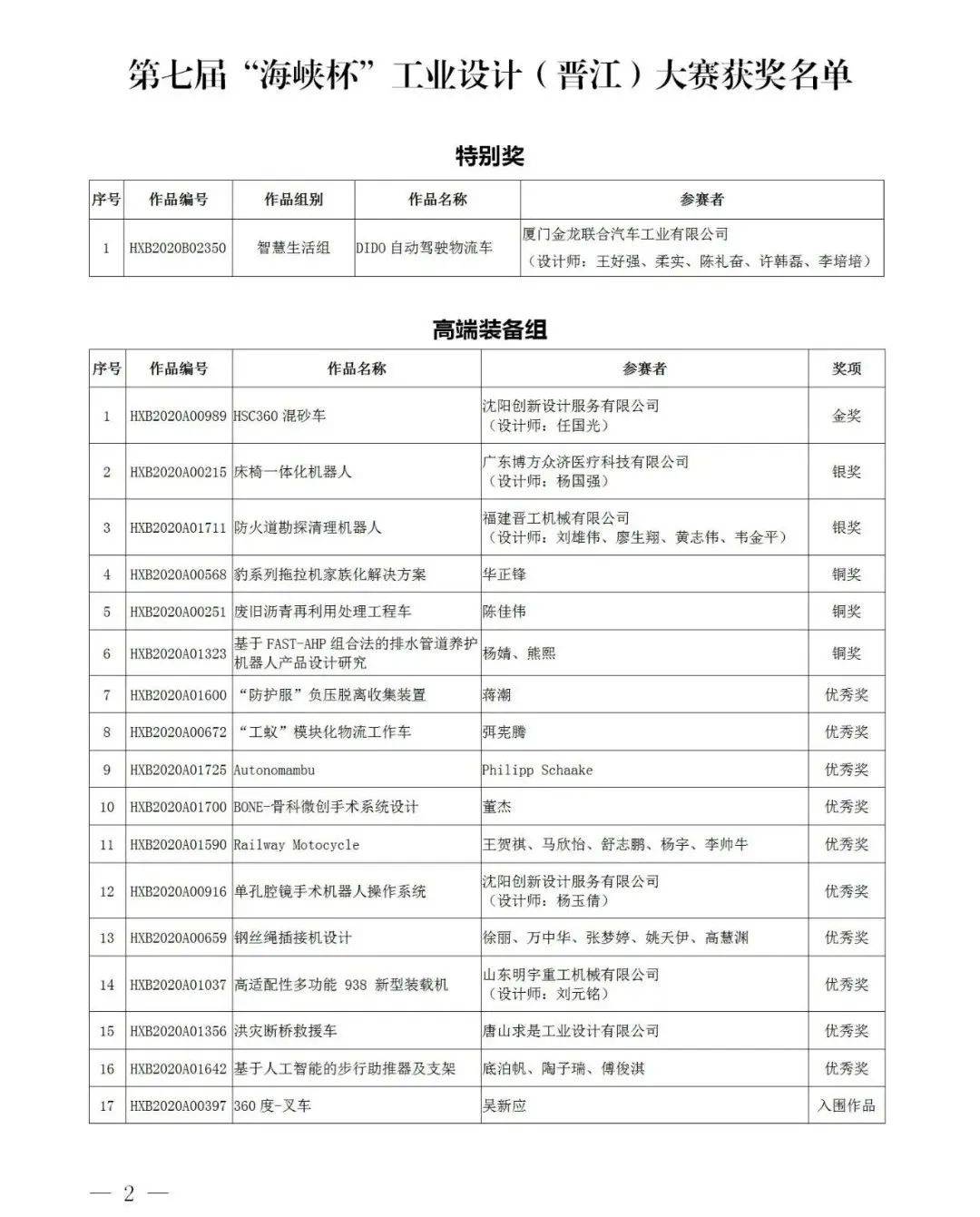第七屆“海峽杯”工業設計(晉江)大賽獲獎名單