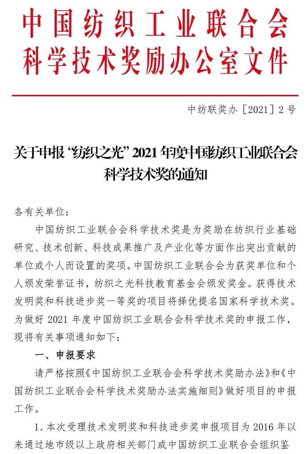通知 |“紡織之光”2021年度中國紡聯科技獎開始申報
