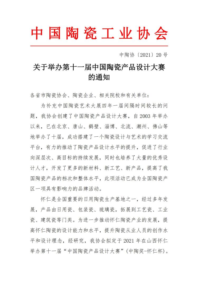 懷仁是全國重要的日用陶瓷生產基地之一,經過多年發展,產品由日用瓷、包裝瓷、琉璃瓷,拓展到工藝瓷、工業瓷、建筑瓷等門類。為進一步推動懷仁陶瓷產業的發展,提 高懷仁陶瓷的設計能力和水平,提升陶瓷從業人員的創作水平和設計理念,經研究,我協會擬定于 2021 年在山西懷仁舉辦第十一屆“中國陶瓷產品設計大賽”(中陶獎-懷仁杯)。請各企業、院校、陶瓷從業者等踴躍參加。現將具體事宜通 知如下: