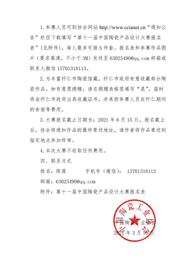 三、參賽方式1.參賽人員可到協會網站 http://www.ccianet.cn“通知公告”欄目下載填寫“第十一屆中國陶瓷產品設計大賽報名表”(見附件),每人最多可報 5 件套。報名表和參賽作品圖片(要求高清,不小于 3M)發送至 63025490@qq.com 郵箱或聯系人微信 13701318113。