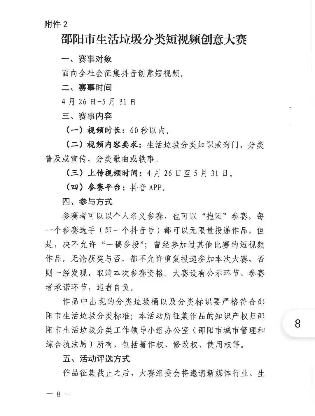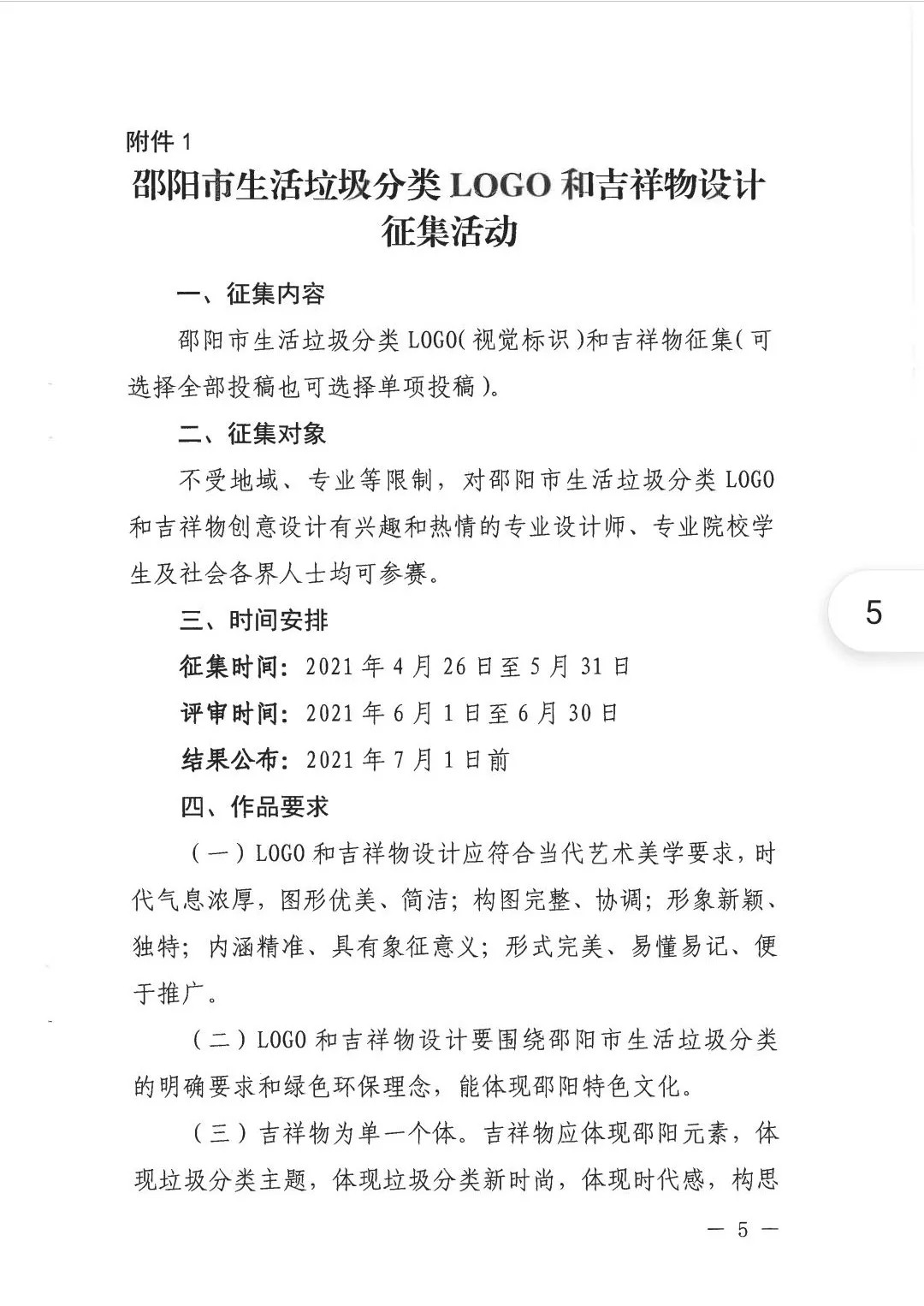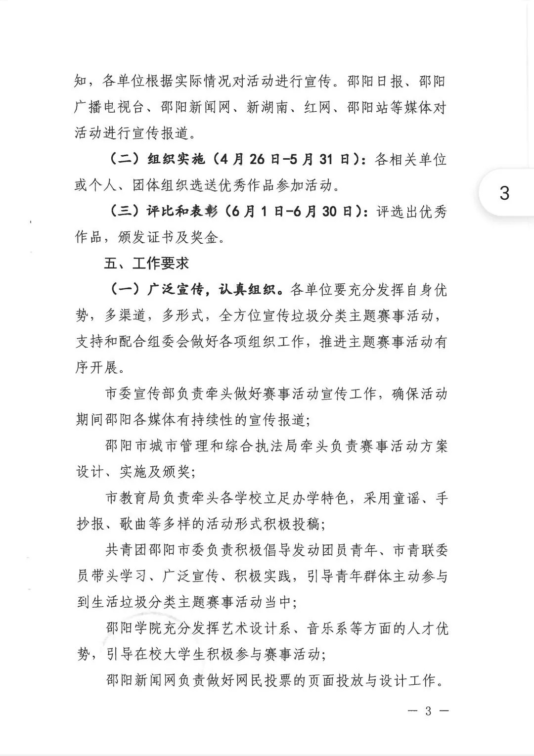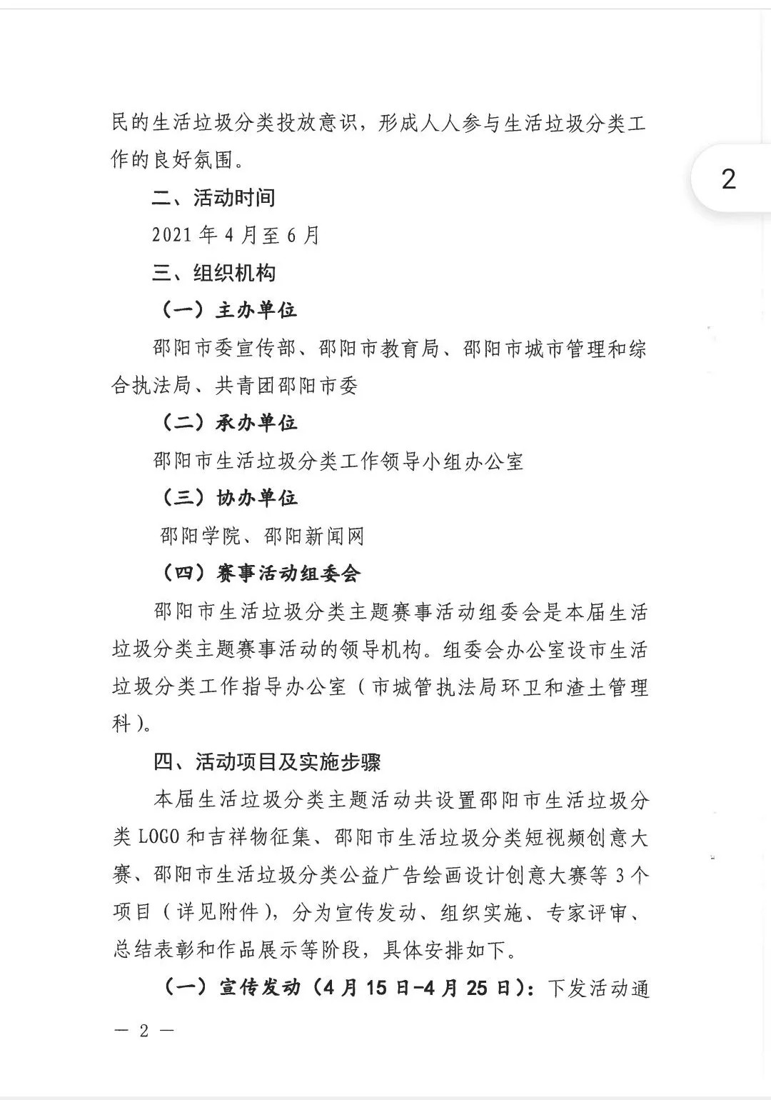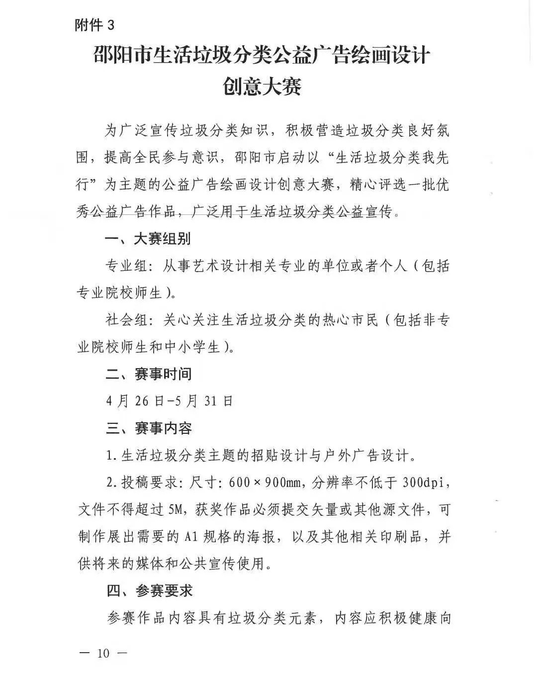 本次主題賽事共設置生活垃圾分類LOGO和吉祥物征集、生活垃圾分類短視頻創意大賽、生活垃圾分類公益廣告繪畫設計創意大賽3個項目,作品征集截止時間為5月31日。詳情請登錄邵陽市城市管理和綜合執法局官方網站,地址是https://cgj.shaoyang.gov.cn/。
