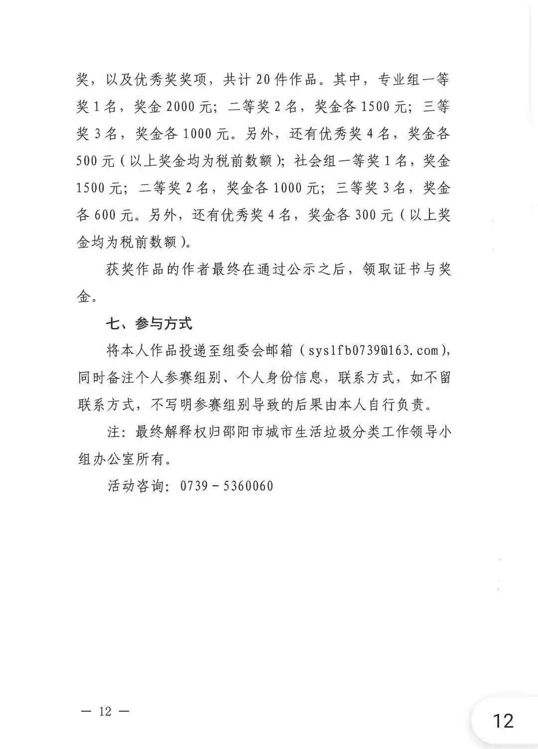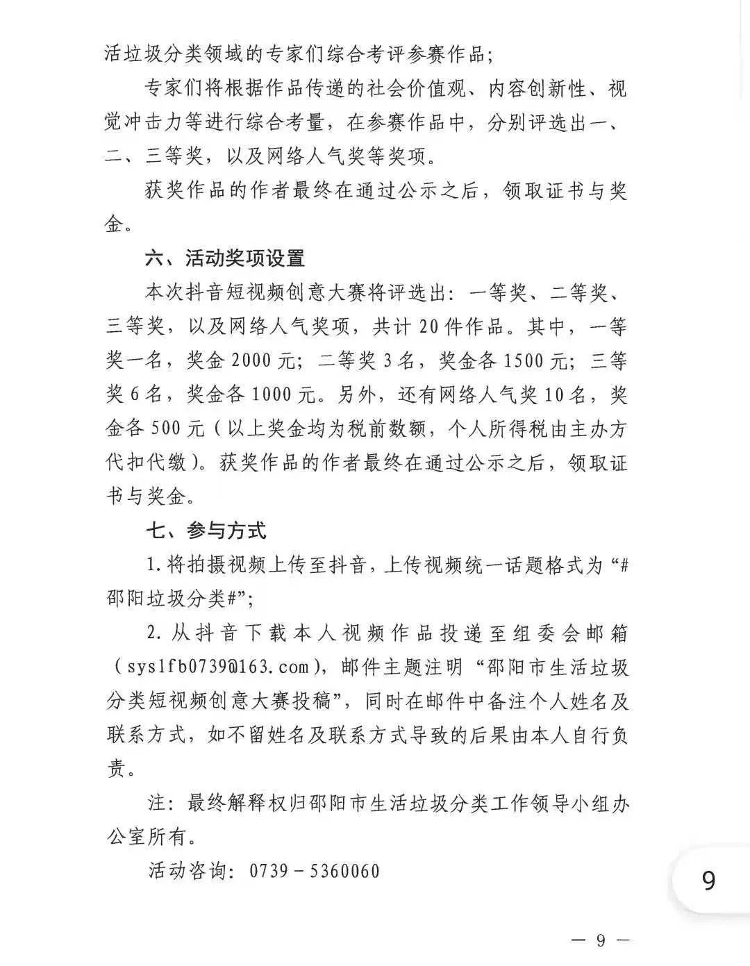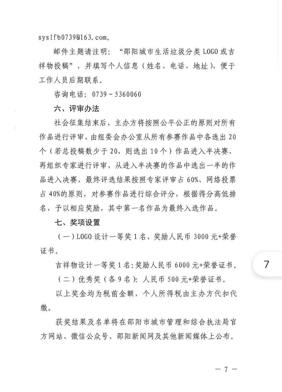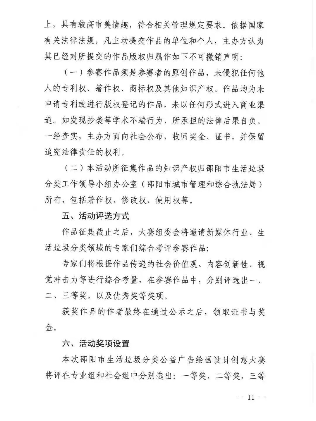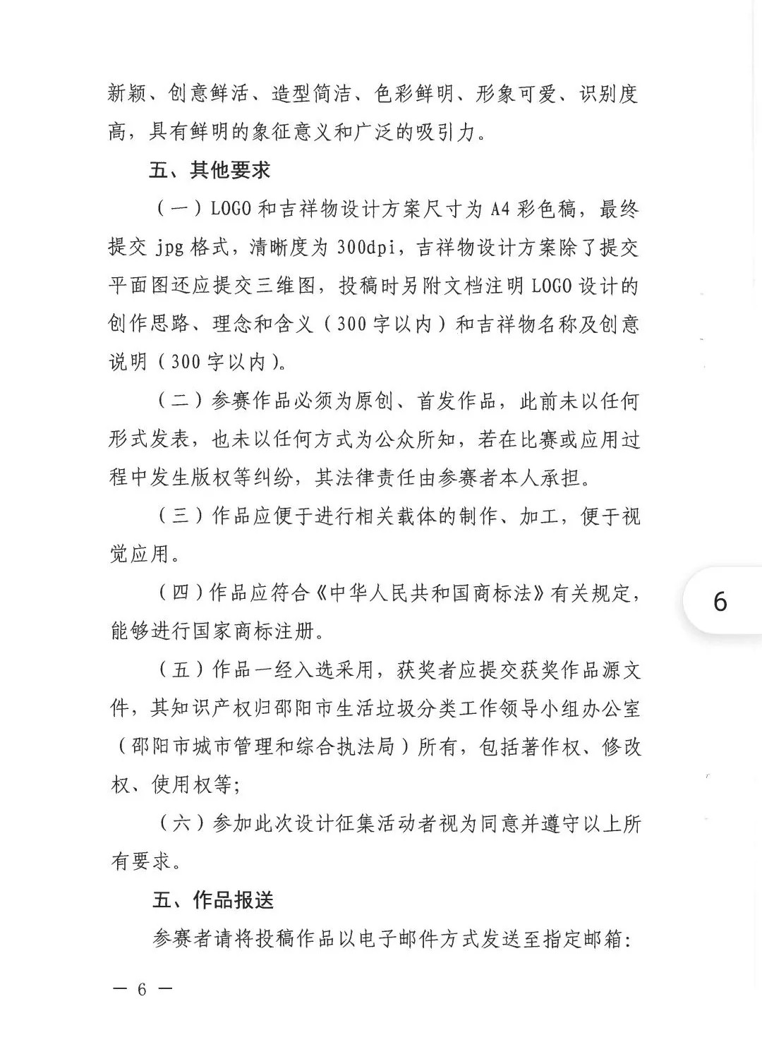 本次主題賽事共設置生活垃圾分類LOGO和吉祥物征集、生活垃圾分類短視頻創意大賽、生活垃圾分類公益廣告繪畫設計創意大賽3個項目,作品征集截止時間為5月31日。詳情請登錄邵陽市城市管理和綜合執法局官方網站,地址是https://cgj.shaoyang.gov.cn/。