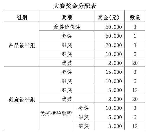 1.產品設計組設金獎1名、銀獎3名、銅獎6名,創意設計組設金獎3名、銀獎6名、銅獎12名,并設立優秀指導教師獎,頒發獎金、獎杯和證書;產品設計組和創意設計組各設優秀獎20名,頒發獎金和證書。