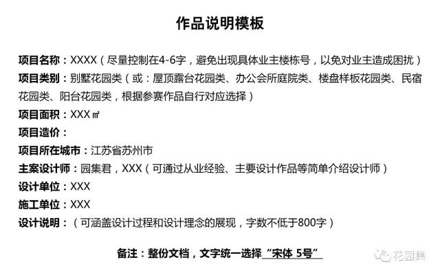 ②以word文檔的形式,提交參賽作品的介紹與說明【文檔里需包括:項(xiàng)目名稱、項(xiàng)目類別、項(xiàng)目面積、項(xiàng)目造價(jià)、項(xiàng)目所在城市、主案設(shè)計(jì)師簡介、設(shè)計(jì)及施工單位、設(shè)計(jì)說明】字?jǐn)?shù)不少于800字,文字統(tǒng)一為宋體、5號字,格式參考下圖: