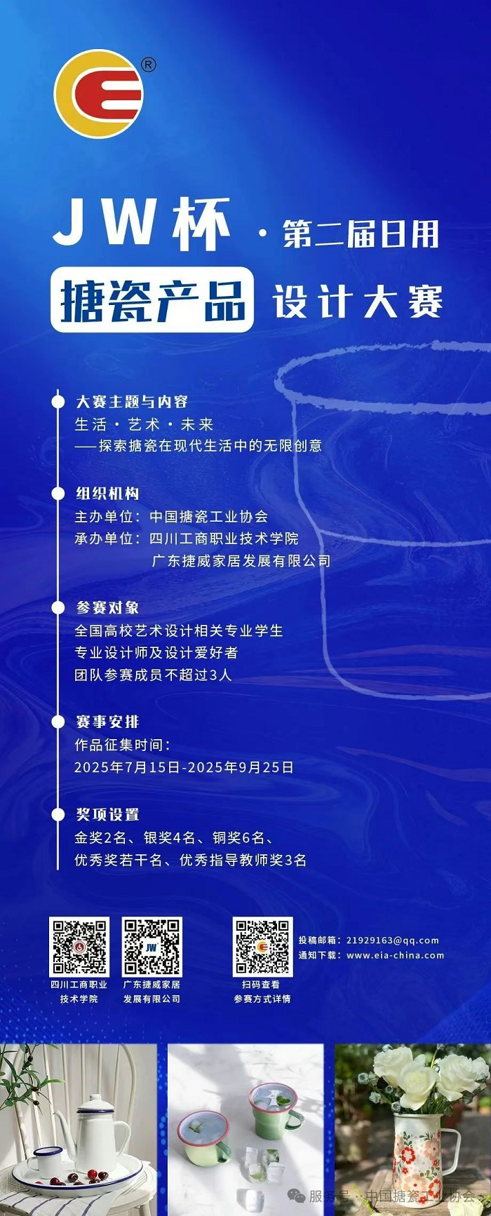 為適應中國日用搪瓷行業創新發展需求,以激發提升搪瓷產品設計創造力、引領日用搪瓷設計文化新風尚為目標,持續推進中國搪瓷行業人才培養基地建設,深化產教融合與校企協同育人機制,延續首屆賽事成果,現決定舉辦“JW杯·第二屆日用搪瓷產品設計大賽”。現將有關事項通知如下: