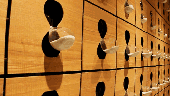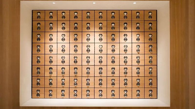 在空間的核心視覺上,設計師希望能鞏固“沙漏”的品牌印象,設置了一面“會定時自動翻轉的沙漏墻”,和天花頂上的由很多沙漏組成的吊燈。
