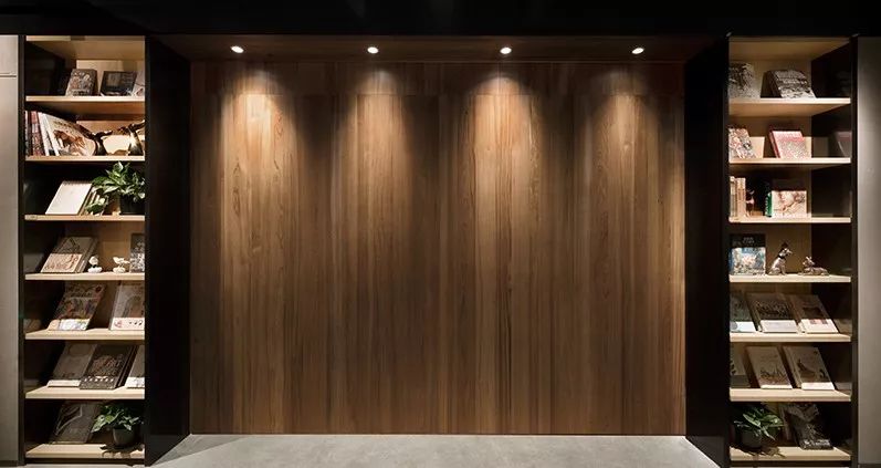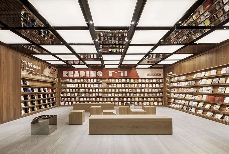 為了突出書房的觀感和儀式感,設計師將書房做了抬高,人們拾級而上,進入知識的世界,書房天花的鏡面吊頂蔓延至書房外,象征知識和力量向外發(fā)散。在不大的店內,級差為空間帶來了更好的節(jié)奏感,而進入書房后視角的切換,也為人們帶來了更為奇妙的感受。