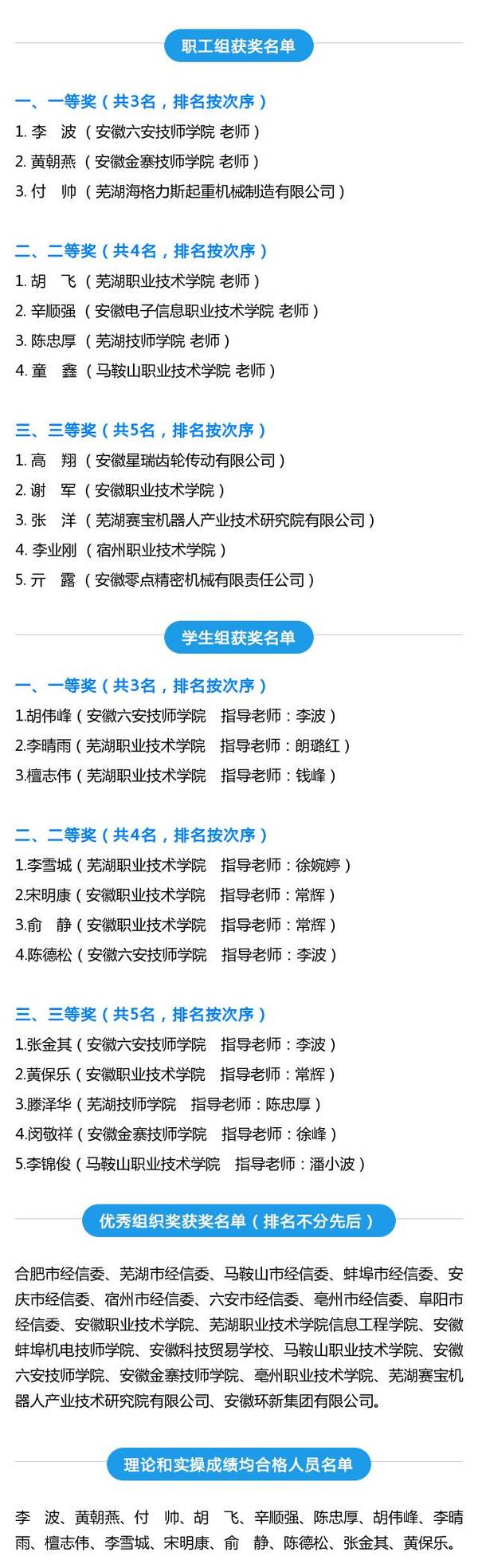 根據(jù)《工業(yè)和信息化部 人力資源社會保障部 教育部 中華全國總工會、共青團中央關于舉辦2017 年中國技能大賽——第二屆全國工業(yè)機器人技術應用技能大賽的通知》文件要求,安徽省經(jīng)濟和信息化委員會、安徽省人力資源和社會保障廳、安徽省教育廳、安徽省總工會、共青團安徽省委員會和六安市人民政府于8月17日在六安市聯(lián)合舉辦了安徽省工業(yè)機器人技術應用技能大賽暨第二屆全國工業(yè)機器人技術應用技能大賽選拔賽。根據(jù)比賽結果,現(xiàn)將職工組獲獎名單、學生組獲獎名單、優(yōu)秀組織獎獲獎名單、理論和實操成績均合格人員名單予以公布。