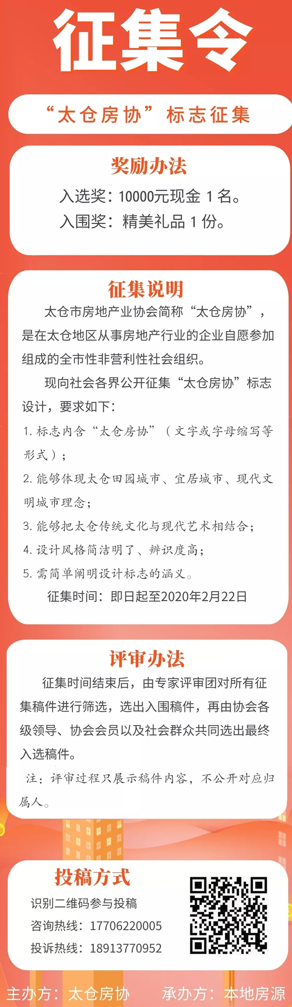 受疫情影響,原定于2月22日結束征集的“太倉房協標志征集令”現調整為3月23日結束征集。