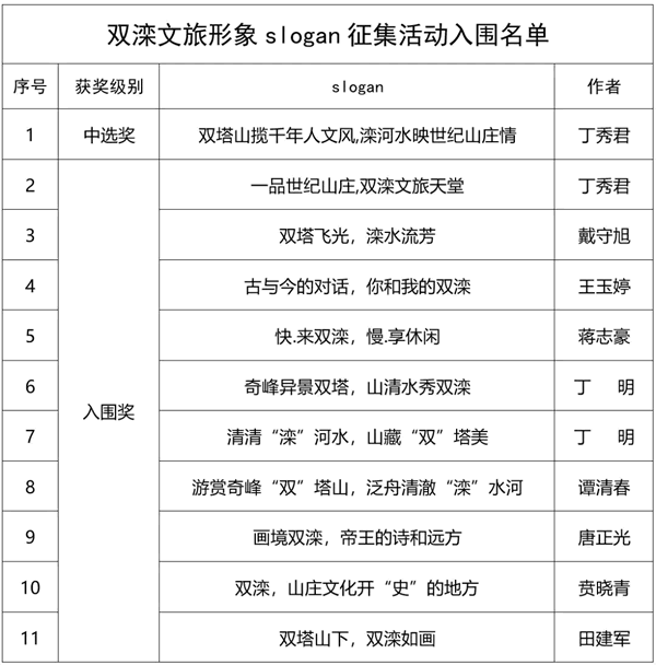備注1:入圍獎第9名“雙灤,山莊文化開‘史’的地方”因出現雷同投稿,故以slogan投稿時間前者優先入圍。