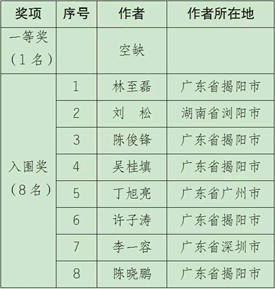 為進一步打造城市品牌,提升揭陽城市形象,反映城市文化內涵,增強市民歸屬感和城市凝聚力,提升揭陽市知名度和美譽度,助力“五城同創”工作,市委宣傳部于2018年6月開展“賢德揭陽”揭陽市城市形象標識征集活動,活動得到廣大作者的大力支持,投稿踴躍。近期,市委宣傳部組織專家對征集到的作品進行評審,共有8件作品入圍?,F將評審結果公布如下: