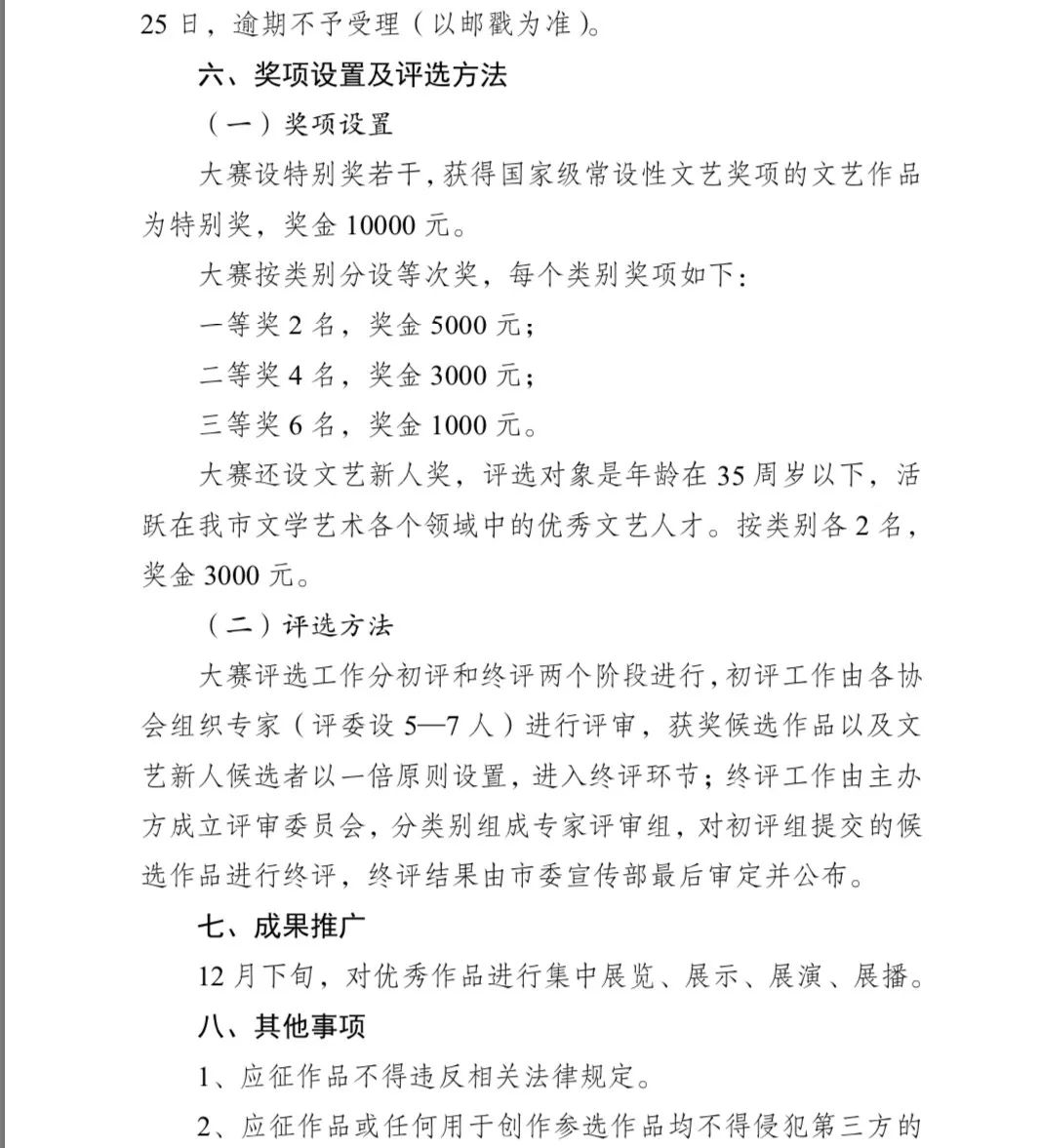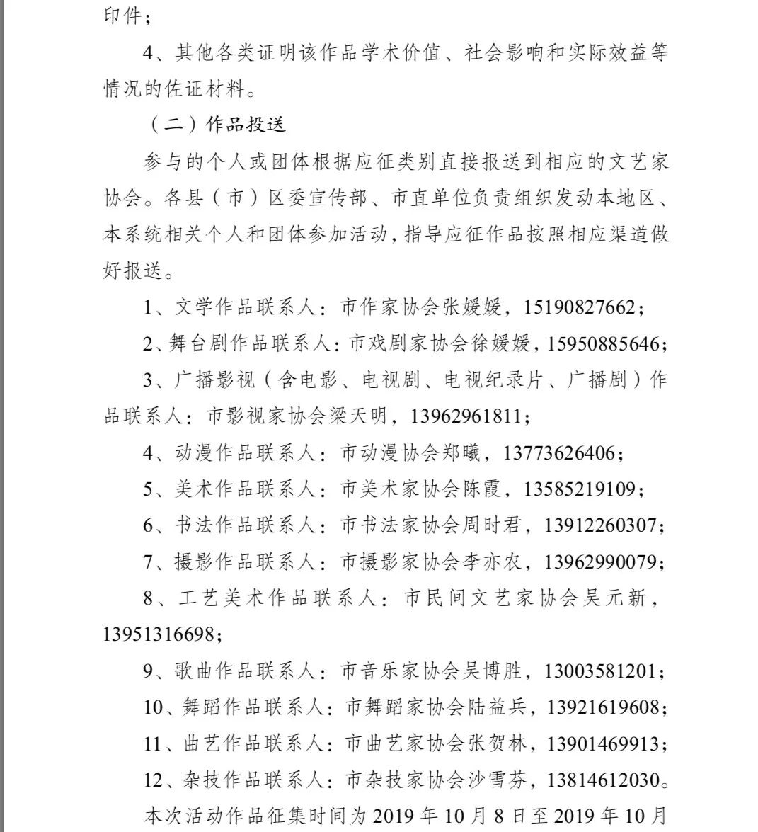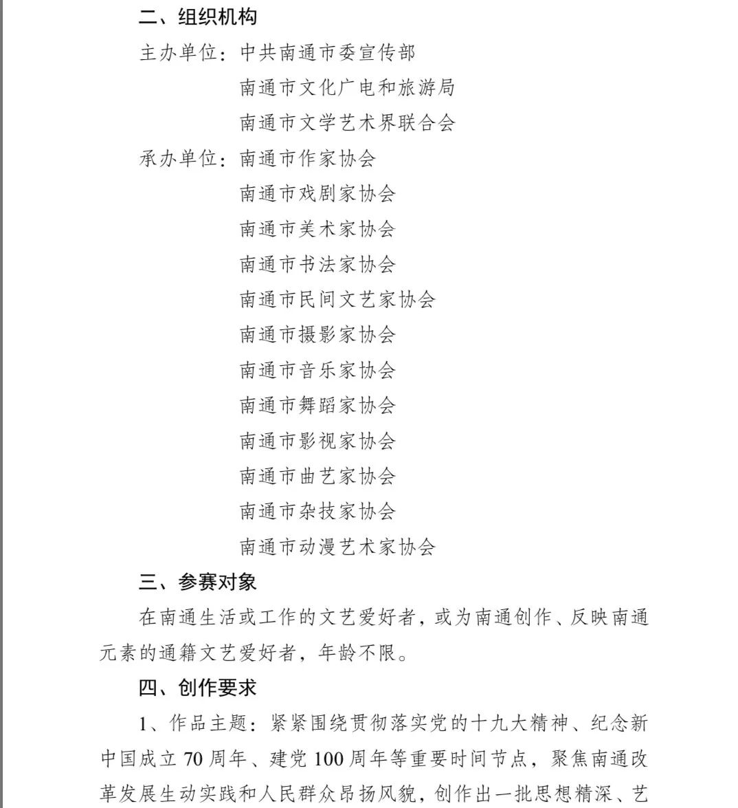 2、獎項設置和評選方法按照市委宣傳部通委宣[2019]42號《關于舉辦首屆南通文學藝術創作大賽的通知》文件精神進行。