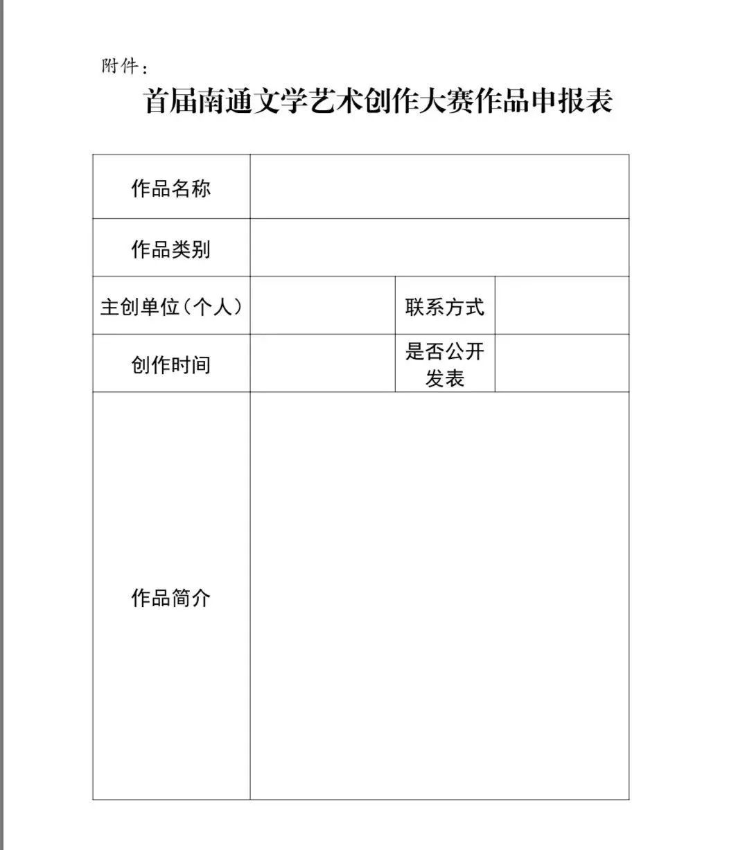 3、所有作品須填寫《首屆南通文學藝術創作大賽作品申報表》,提供作品的創意、主題闡述及內容簡介,并提供作品的DVD數據光盤或U盤,一式五份。(所有文字材料、光盤和U盤不再退回)。