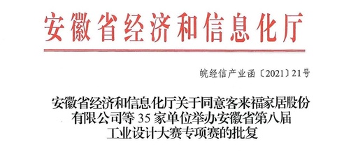 2021年2月2日,安徽省經濟和信息化廳《關于同意客來福家居股份有限公司等35家單位舉辦安徽省第八屆工業設計大賽專項賽的批復》(皖經信產業函〔2021〕21號)正式下發,專項賽數量再創新高。