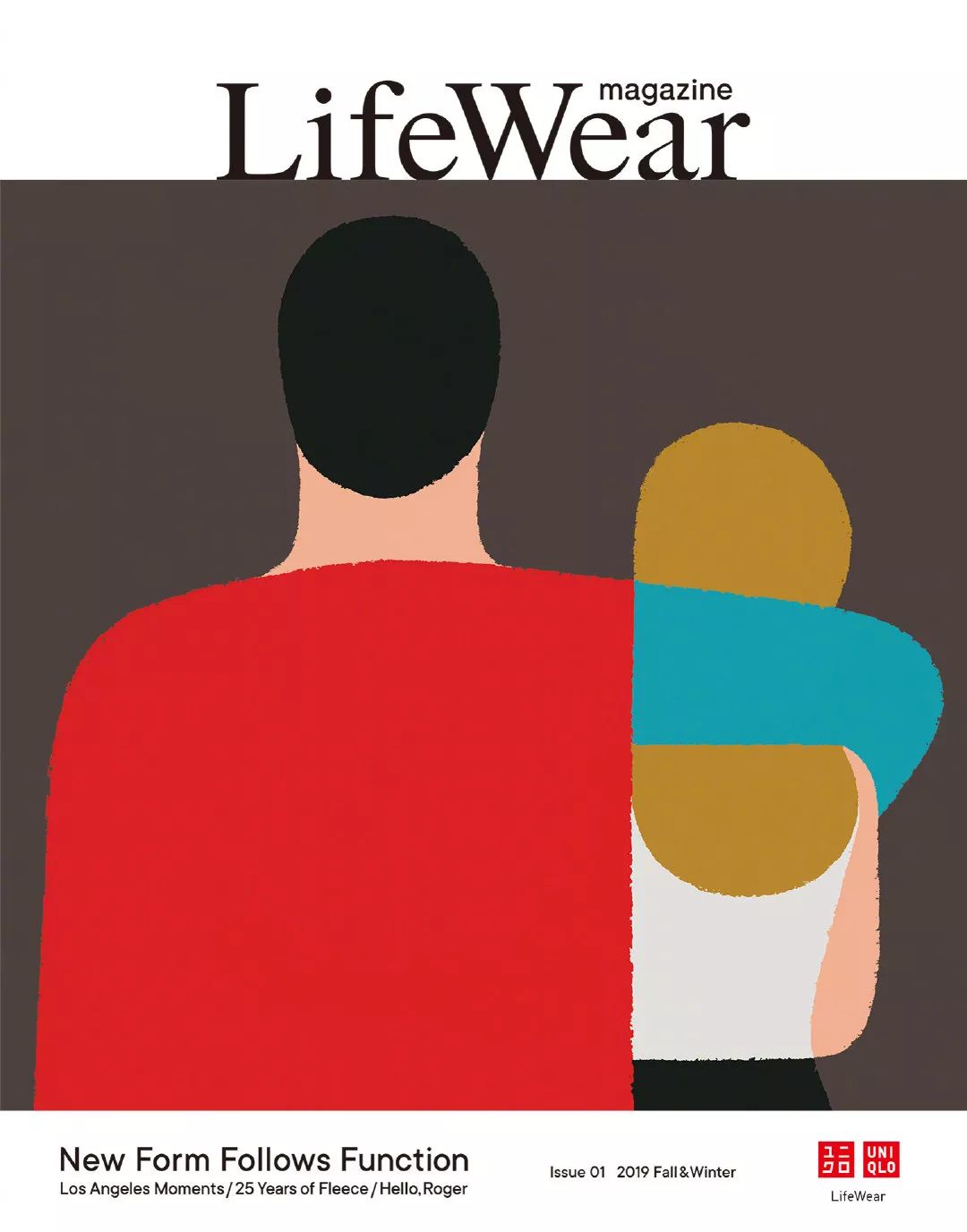 作為首次出書的優(yōu)衣庫 雜志封面的版式設(shè)計也是走當(dāng)下流行的扁平風(fēng) 簡潔圓滑的矢量圖形搭配色塊 勾勒出了主體人物的線條輪廓 主體人物呈現(xiàn)了一個男性單手搭著女性肩膀的形態(tài) 凸顯出情侶間親昵且舒適的身體動作 達(dá)到一定的藝術(shù)心理暗示