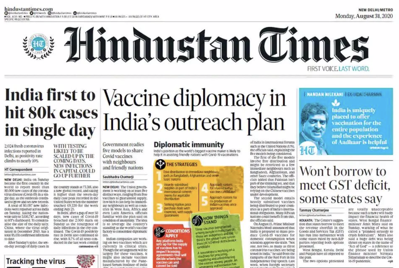 印度斯坦時報(Hindustan Times)創辦于1924年,是讀者數僅次于《印度時報》的印度英文報紙,也是印度前三大英文報紙之一,發行量超過110萬份。2020年8月31日,《印度斯坦時報》發布全新的LOGO和報紙設計,這次該報紙自2009年采用黑色和藍色小寫字標以來首次重新設計LOGO。