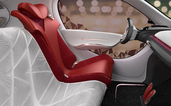 2U:強調有沖擊力的個性表達,更注重都市女性生活場景和空間的轉換。色彩概念我們稱之為Radiant Ruby。紅色鉆石切割的元素無處不在,貫穿整個內外飾主題,同時又引入3D打印的白色羽毛作為另一個重要的設計意向,渲染一種輕盈、細膩、柔和的氛圍。色彩材質都在這個大的主題下。盡量渲染這種強烈的沖撞感,冷與暖,軟與硬,輕與重,高光澤與強機理,最大程度強調個性化與沖擊力。