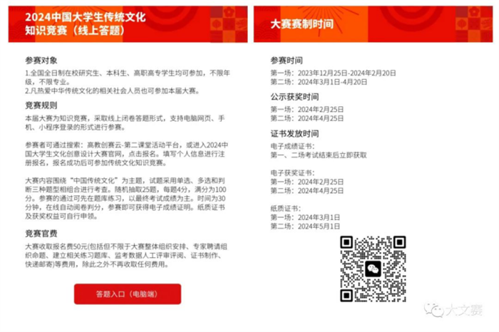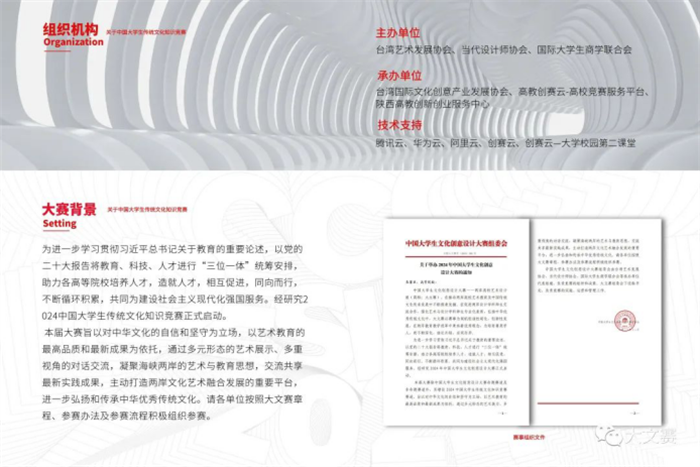本屆大賽除中國大學生文化創意設計大賽命題賽道及非命題賽道外,另增設2024中國大學生傳統文化知識競賽賽道。旨在進一步推動兩岸高校藝術教育及中國傳統文化交流發展,促進兩岸設計學科師生交流合作,強化藝術與設計學科師生專業化素質,弘揚中華優秀傳統文化。