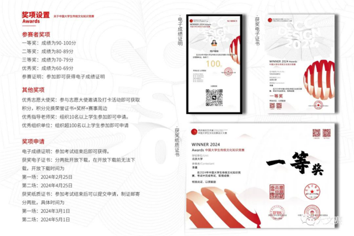 (四)志愿者獎項:本屆大賽招募大賽志愿大使,各參賽者可通過大賽官網報名參加:大賽宣傳打卡、邀請參賽、完成校內物料宣發等活動獲取積分或領取權益:優秀志愿者證書、獎牌、獎杯等其他權益內容。