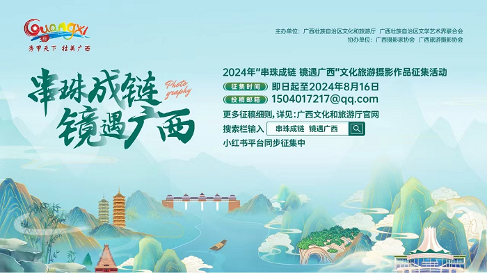 為持續擴大“秀甲天下 壯美廣西”品牌的知名度和影響力,通過文化旅游主題攝影作品,全方位、全景式展示廣西文化旅游資源及人文資源,大力實施“串珠成鏈”工程,打造精品旅游線路,扎實推動我區文化旅游業高質量發展,加快建設文化旅游強區和世界旅游目的地,特舉辦2024年“串珠成鏈 鏡遇廣西”文化旅游攝影作品征集活動。歡迎國內外攝影家和攝影愛好者積極參與投稿。