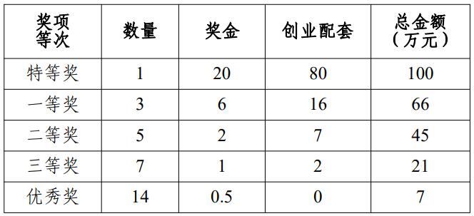1.創業賽道鄉村振興專項:入圍立項團隊 30 支,設特等獎 1 個,獎金 100 萬元,其中 20 萬元用于獎勵團隊,80 萬元作為項目啟動資金;設一等獎 3 個,獎金 22 萬元/支團隊,其中 6 萬元用于獎勵團隊,16 萬元作為項目啟動資金;設二等獎 5 個,獎金 9 萬元/支團隊,其中 2 萬元用于獎勵團隊,7 萬元作為項目啟動資金;設三等獎 9 個,獎金 3 萬元/支團隊,其中 1 萬元用于獎勵團隊,2 萬元作為項目啟動資金;設優秀獎 14 個,獎金 0.5 萬元/支團隊。上述獎金為稅前金額。特等、一、二、三等獎獎勵將在項目落地后分期支付(落地后支付獎金,6 個月后支付第一筆創業配套,18 個月后支付第二筆),具體條件詳見實施細則。優秀獎將在項目落地后一次性支付。