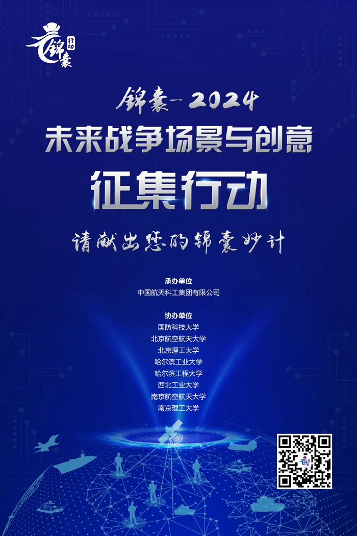 “錦囊-2024”行動,誠邀各類機構、團體和個人,暢想未來戰(zhàn)爭形態(tài),設計未來作戰(zhàn)場景, 圍繞未來戰(zhàn)爭可能面臨的問題研提解決方案建議,探究未來勝戰(zhàn)奧秘。