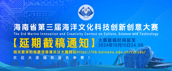 海南省第三屆海洋文化科技創新創意大賽于2024年4月12日正式開啟報名通道,大賽啟動以來受到了全國相關專業高校師生的廣泛關注和踴躍投稿。為了征集更多優質稿件,給參賽者留出更充裕的創作和完善時間,賽出風格、賽出水平,經大賽組委會研究決定,大賽截稿時間延至2024年10月15日24:00。相關賽程安排相應調整。