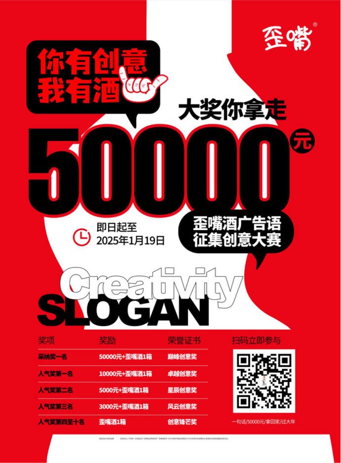 為了進一步強化品牌形象,歪嘴酒特此舉辦此次廣告語征集創意大賽,旨在發掘出那些能夠精準傳達歪嘴酒品牌核心價值和獨特魅力的精彩創意。歪嘴酒誠摯邀請社會各界的創意精英踴躍參與投稿,共同為歪嘴酒打造一句具有感染力、親和力和市場傳播力的廣告語!