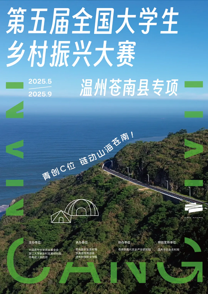 為激發大學生的創新活力,推進創新鏈、產業鏈、資金鏈、人才鏈深度融合,構建產學研用深度融合的技術創新體系,助力縣域人才要素流動,推動農業高質量發展,擬舉辦第五屆全國大學生鄉村振興大賽·溫州蒼南縣專項(以下簡稱“大賽”)。