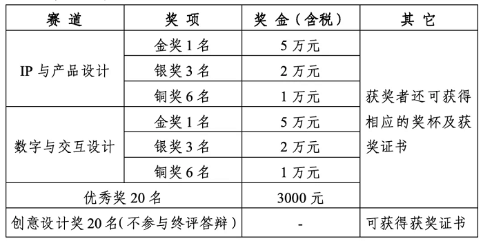 大賽設金獎2名、銀獎6名、銅獎12名,優秀獎20名,創意設計獎20名(入圍獎、不參與終評答辯)。共60個獎項,獎金合計40萬元。