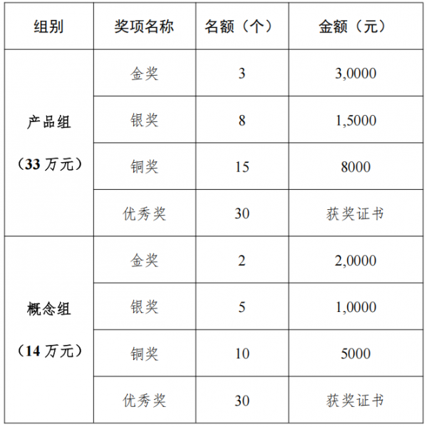 本次大賽獎金合計57萬元。其中產品設計組獎金33萬元,概念設計組獎金14萬元。