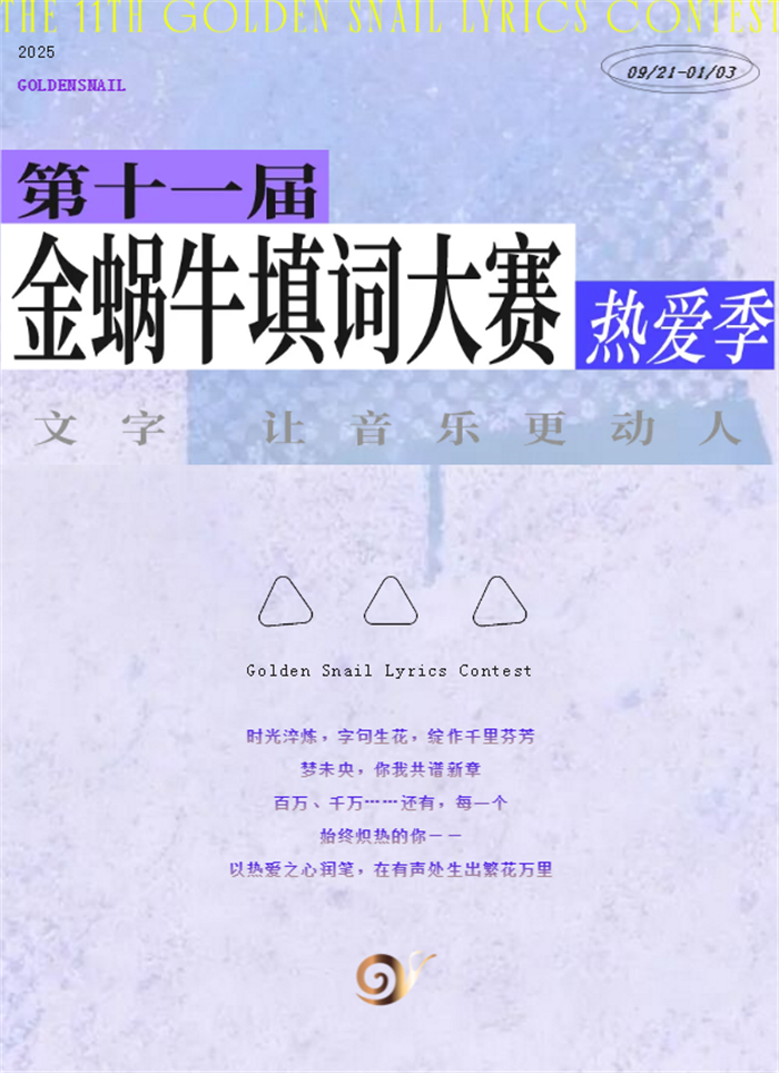金蝸牛詞人榜(S榜)、合作單位及院校等相關分賽區,投稿方式及選拔通道、推選、考核機制,以合作單位通知、公告為準。# 新聲獎作品評選 # 僅針對2024年11月31日到2025年11月31日期間發表的歌詞作品,金蝸牛簽約詞人均可通過內部郵箱投稿參賽,詳細內容將于近期在本公眾號發布,敬請關注。