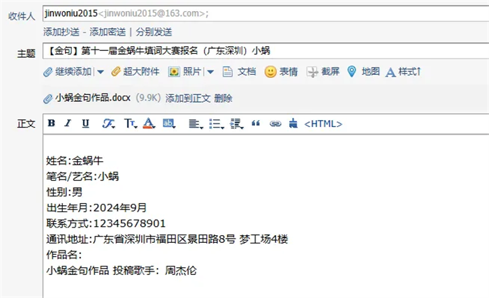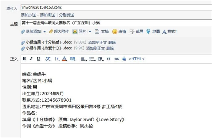 ② 郵件正文:請將姓名、筆名/藝名(無則不填)、性別、出生年月、聯系方式、通訊地址與作品名(填詞、作詞作品名)等個人信息,按照以上順序依次填寫至郵箱正文。