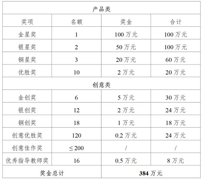 1.五金獎設(shè)產(chǎn)品類賽道金星獎1項、銀星獎2項、銅星獎3項、優(yōu)勝獎10項;創(chuàng)意類賽道金創(chuàng)獎6項、銀創(chuàng)獎12項、銅創(chuàng)獎18項、創(chuàng)意優(yōu)勝獎120項、創(chuàng)意佳作獎不超過200項,優(yōu)秀指導(dǎo)教師獎16名。獎金總額384萬元。