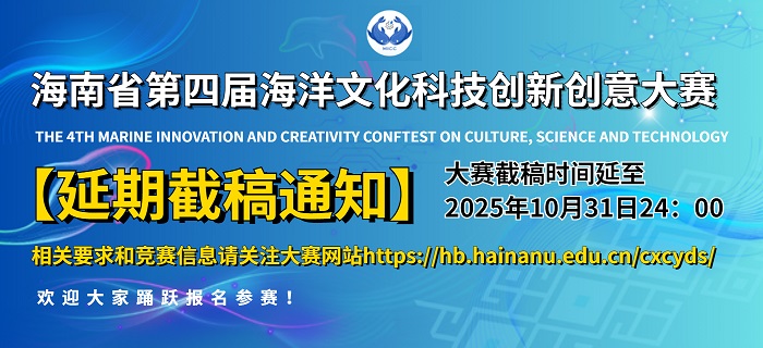 海南省第四屆海洋文化科技創新創意大賽于2025年7月17日正式開啟報名通道,大賽啟動以來受到了全國相關專業高校師生的廣泛關注和踴躍投稿。近期臨近大賽截稿,參賽系統平臺出現大量參賽人員同時間提交參賽作品,導致網站平臺堵塞,較多參賽者反映無法成功上傳作品。為了征集更多優質稿件,給參賽者留出更充裕的創作和完善時間,賽出風格、賽出水平,經大賽組委會研究決定,大賽截稿時間延至2025年10月31日24: 00。相關賽程安排相應調整。