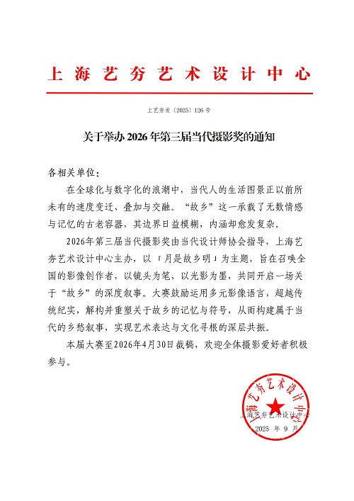 2026年第三屆當代攝影獎由當代設計師協會與上海藝夯藝術設計中心共同舉辦,秋季賽以 「月是故鄉明」為主題,旨在召喚全國的影像創作者,以鏡頭為筆,以光影為墨,共同開啟一場關于“故鄉”的深度敘事。大賽鼓勵運用多元影像語言,超越傳統紀實,解構并重塑關于故鄉的記憶與符號,從而構建屬于當代的鄉愁敘事,實現藝術表達與文化尋根的深層共振。