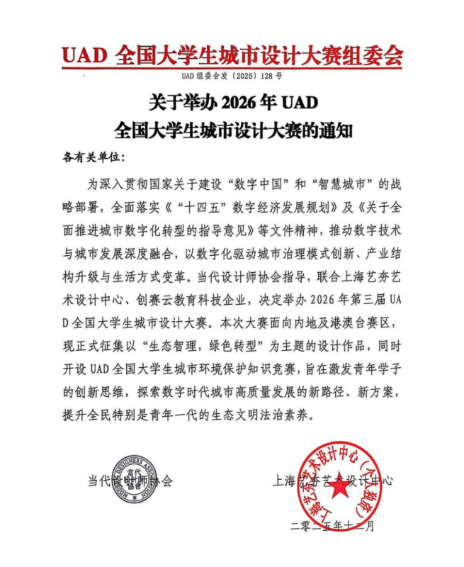 為深入貫徹國(guó)家關(guān)于建設(shè)“數(shù)字中國(guó)”和“智慧城市”的戰(zhàn)略部署,全面落實(shí)《“十四五”數(shù)字經(jīng)濟(jì)發(fā)展規(guī)劃》及《關(guān)于全面推進(jìn)城市數(shù)字化轉(zhuǎn)型的指導(dǎo)意見》等文件精神,推動(dòng)數(shù)字技術(shù)與城市發(fā)展深度融合,以數(shù)字化驅(qū)動(dòng)城市治理模式創(chuàng)新、產(chǎn)業(yè)結(jié)構(gòu)升級(jí)與生活方式變革,白名單大賽網(wǎng)、當(dāng)代設(shè)計(jì)師協(xié)會(huì)、香港高等教育出版社城鄉(xiāng)規(guī)劃學(xué)科專業(yè)指導(dǎo)委員會(huì)聯(lián)合智慧城市發(fā)展研究中心,決定共同舉辦2026年第三屆UAD全國(guó)大學(xué)生城市設(shè)計(jì)大賽。本次大賽面向內(nèi)地及港澳臺(tái)賽區(qū),現(xiàn)正式征集以“生態(tài)'智'理,綠色轉(zhuǎn)型”為主題的設(shè)計(jì)作品,旨在激發(fā)青年學(xué)子的創(chuàng)新思維,探索數(shù)字時(shí)代城市高質(zhì)量發(fā)展的新路徑、新方案。