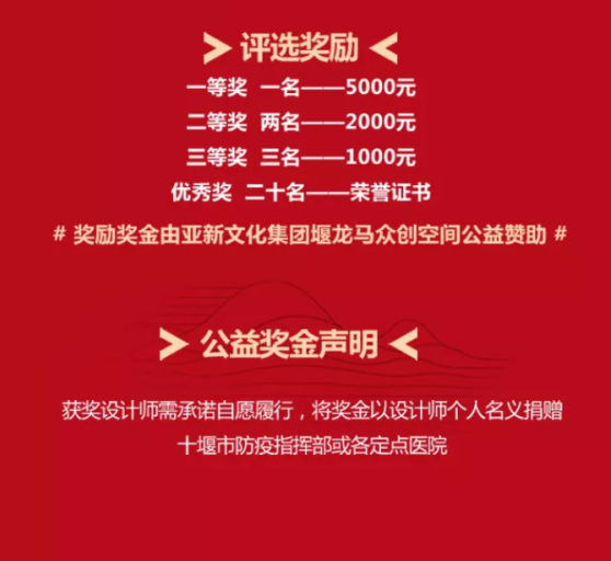 不限地域,不限年齡,不限職業,畫面必須出現“龍馬十堰,文創戰疫”的大賽主題,通過多角度、多形式、多風格的方式,反映疫情防控戰疫中的真善美,可以是單幅作品,也可以是系列作品(系列作品最高不超過4張),但需要是為本次十堰邀請賽原創,作品可署名設計師姓名,以平面設計作品傳播知識,堅定信心,凝聚力量,溫暖人心。