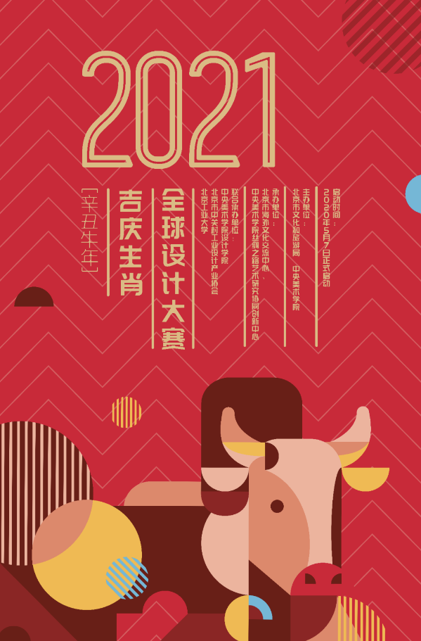 由北京市文化和旅游局與中央美術學院共同主辦的品牌文化活動—2021全球吉慶生肖設計大賽(辛丑牛年),以 2021 年的中國生肖形象“牛”為設計主題,面向全球范圍征集優秀的設計作品。大賽已連續舉辦六屆,旨在向全球傳播中國的生肖文化和春節文化,用設計語言融貫海內外文化交流,賦予傳統生肖新的生命力與影響力,講好中國故事,傳播好中國聲音。