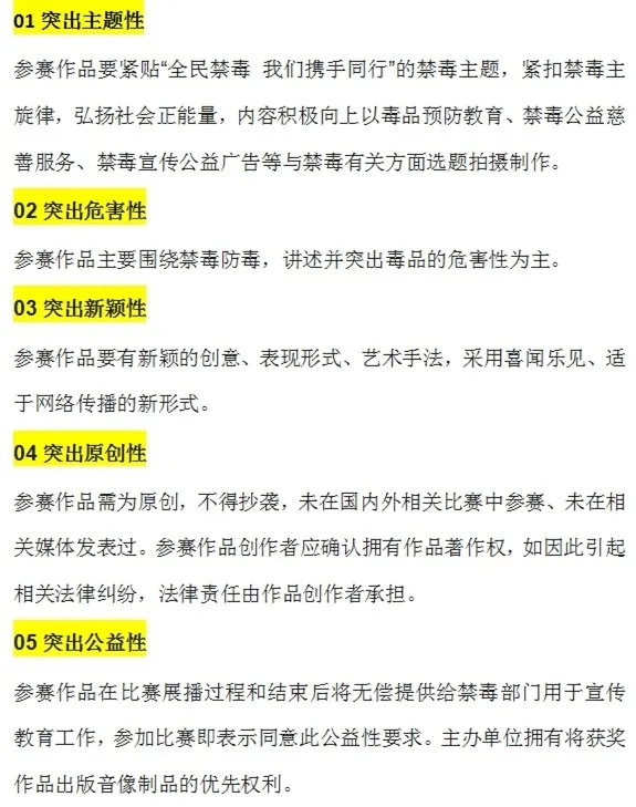 ①短視頻作品形式可以是微電影、紀實短片、視頻剪輯、公益廣告、動漫、漫畫、動畫、歌曲(包括說唱)等流行形式進行禁毒題材的藝術創作,要求內容精煉、節奏緊湊。