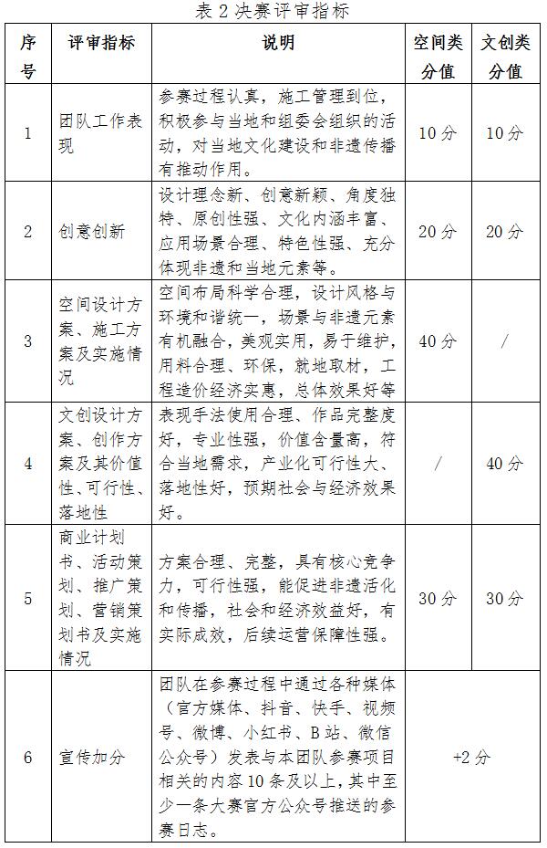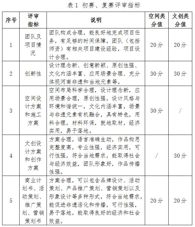 “黃河之村”(空間類)項目和“黃河之禮”(文創類)項目初賽、復賽評審指標與分值參見表1,決賽評審指標與分值參見表2。