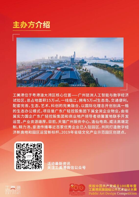 由廣州市民族宗教事務局指導,中共廣州市海珠區(qū)委統戰(zhàn)部、廣州市海珠區(qū)民族宗教事務局、工美港·國際數字創(chuàng)新中心共同發(fā)起“建黨百年成就新 民族團結一家親”——慶祝中國共產黨成立100周年暨工美港民族團結公共藝術設計大賽,以“中華民族一家親 同心共筑中國夢”為主題,面向全國優(yōu)秀創(chuàng)意藝術設計人才公開征集公共藝術設計作品。大賽經過近兩個月征集,現已有許多優(yōu)秀創(chuàng)作人投稿作品,目前已進入作品征集最后階段。