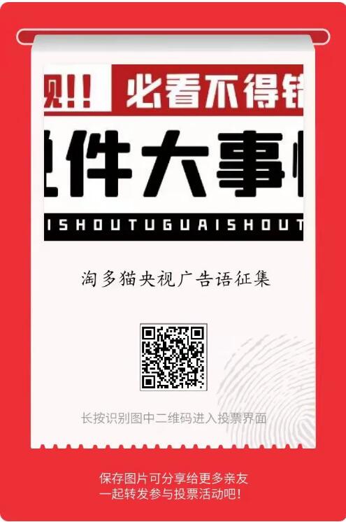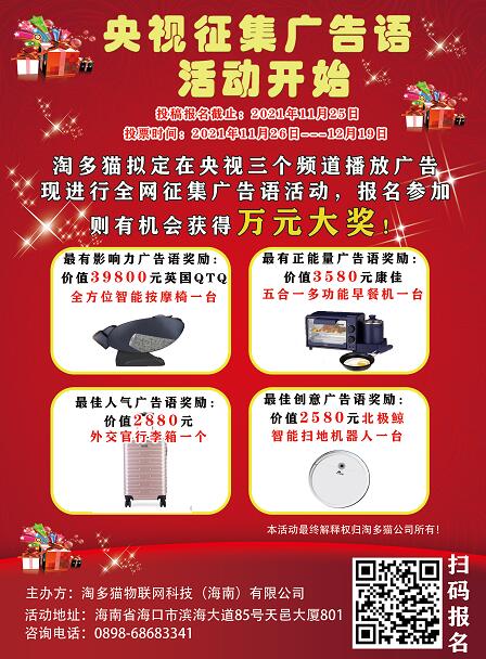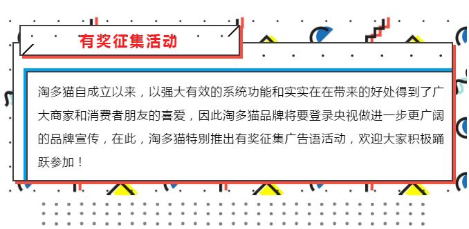 淘多貓擬定在央視三個頻道播放廣告,現(xiàn)進行全網廣告語征集活動,報名參加,則有機會獲得萬元大獎!
